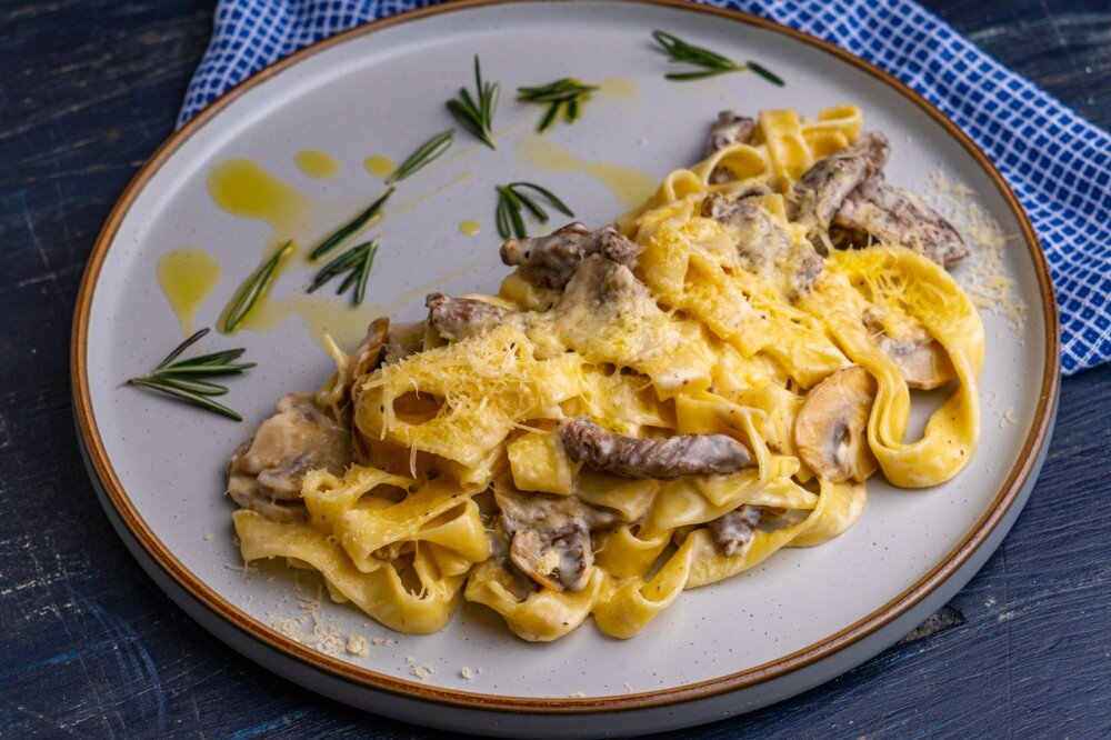 Паста по-итальянски в сливочном соусе с говядиной, грибами и трюфельным маслом. Роскошные макароны – всегда беспроигрышный вариант, когда меню кажется слишком сложным.