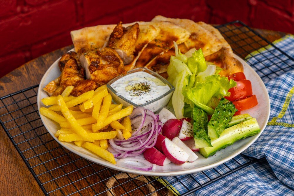 По многочисленным просьбам продолжаем греческие каникулы в Цоколе! Греческое блюдо из категории полезного фастфуда. Куриное бедро на гриле, с яркой палитрой овощей, соусом и лепёшкой. *Паракало фАтэ!
