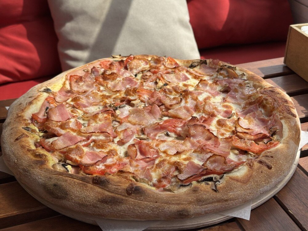 На сцену выходит воплощение сытности и гастрономического изобилия. Тонкий вкус толстой пицце задает легкий чесночный соус. Он окутывает копчёный карбонад, колбаски, куриную грудку и ветчину. Томаты, шампиньоны, сыр моцарелла и хрустящий бекон добавляют разнообразия текстур и вкусов. Насыщенность и питательность этой Царицы зверей среди Пицц надолго укрощают животный голод всей семьи.