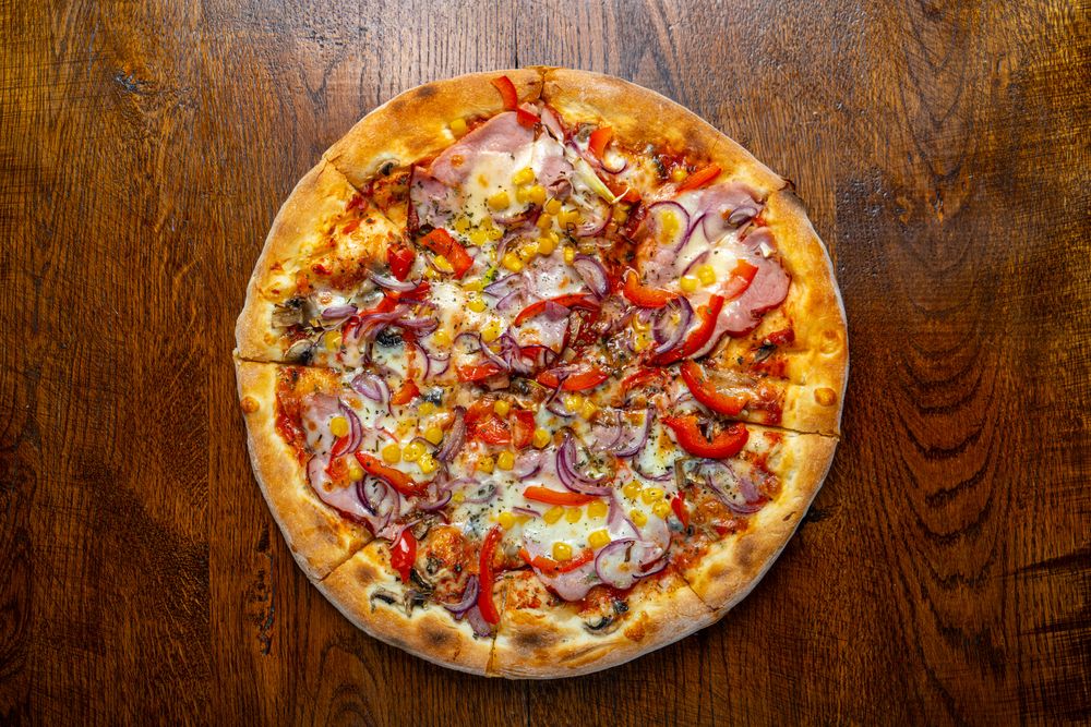 Копченый карбонат, перец болгарский, красный лук, кукуруза, шампиньоны и моцарелла