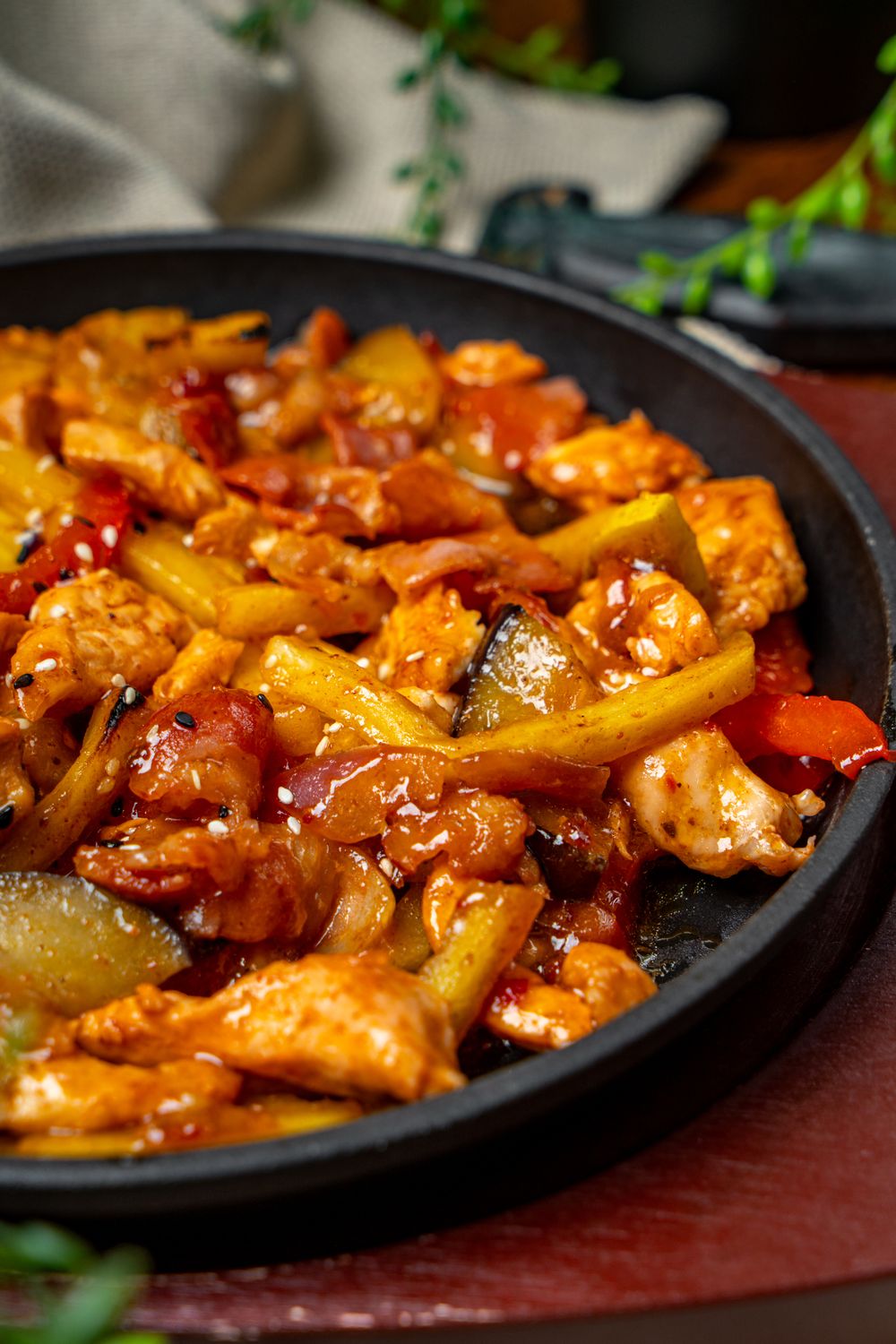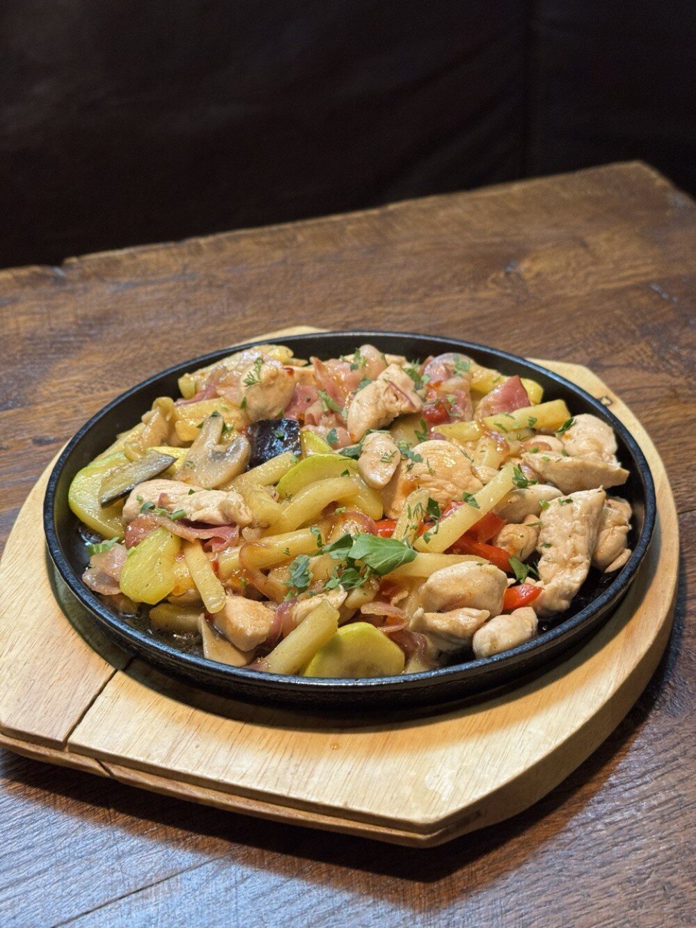 Куриное филе, бекон, картофель фри, перец болгарский, шампиньоны, цукини, баклажан, красный лук, томленные с соусом свит-Чили