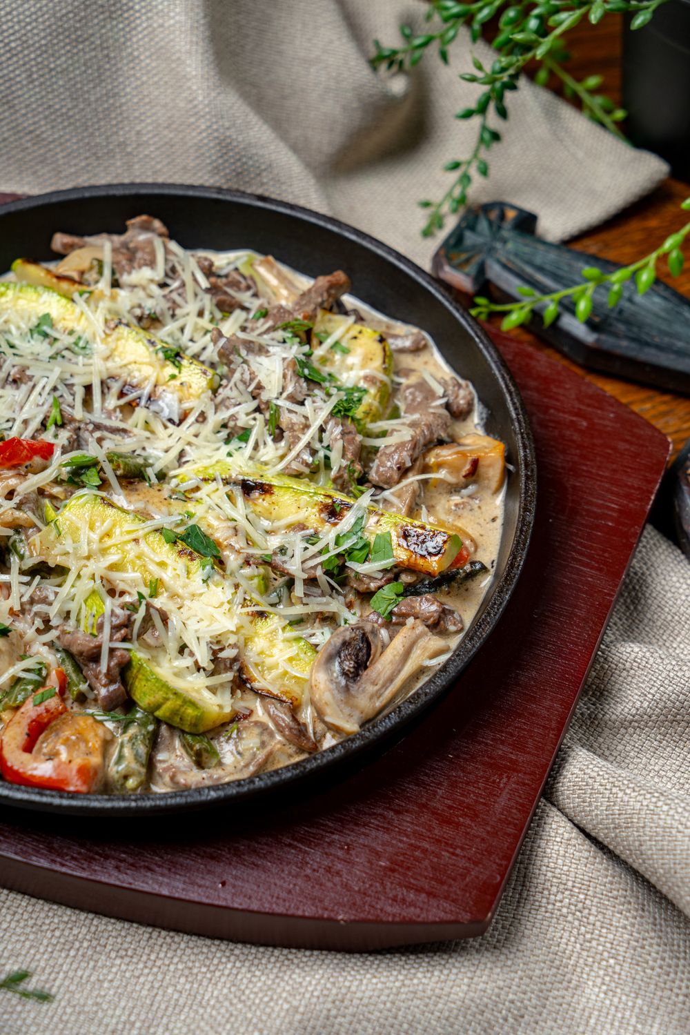 Филе говяжьей вырезки, лук репка, перец болгарский, цукини, шампиньоны, стручковая фасоль, томленая в сливка, с сыром пармезан