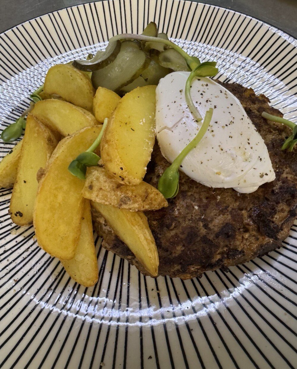Говяжья котлета с красным луком, болгарским перцем, помидорами, с сыром моцарелла и пряными специями в паре с яйцом пашот и картофельными дольками
