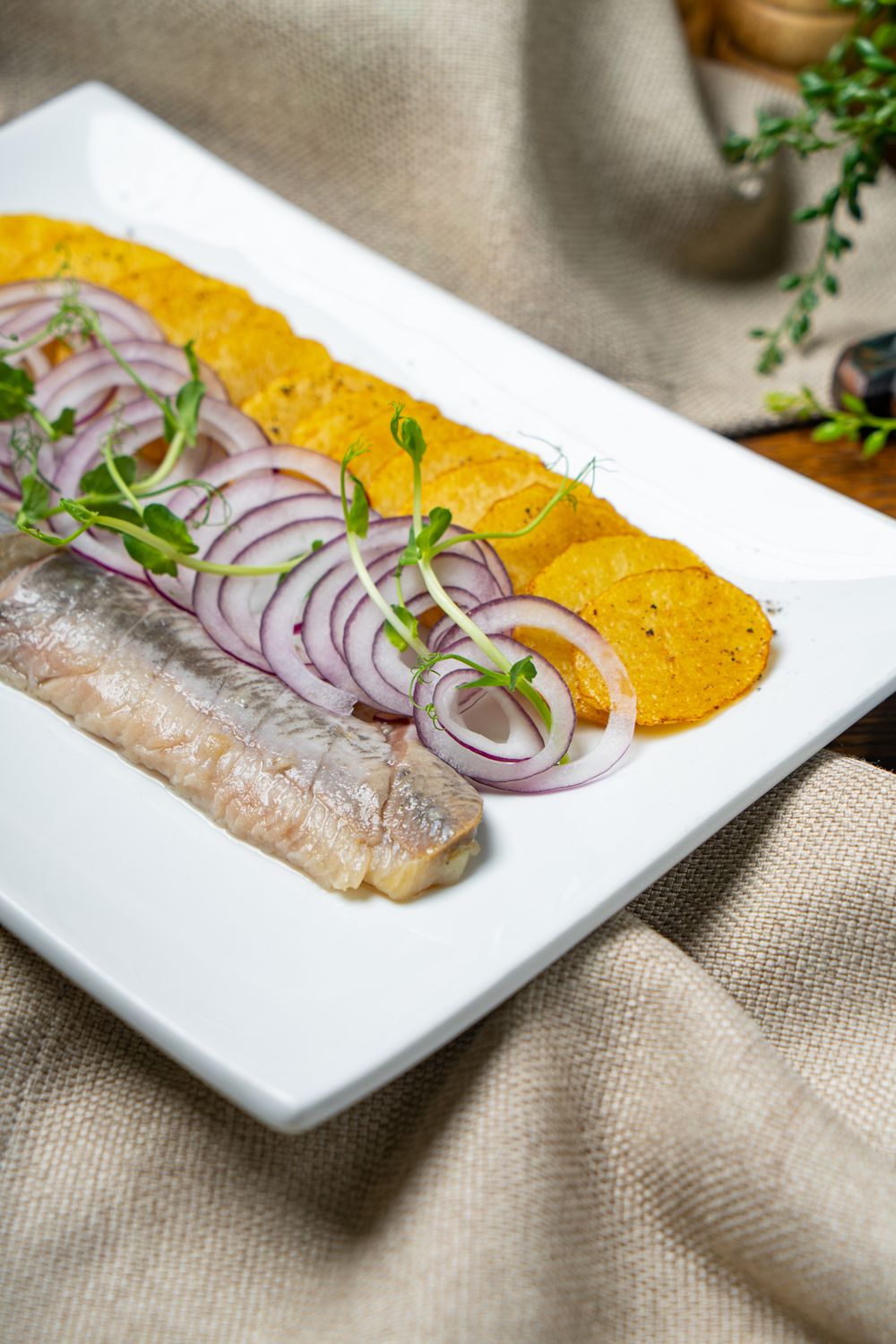 Филе селедки, обжаренный картофель, красный лук и зелень