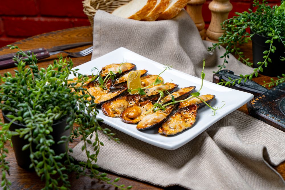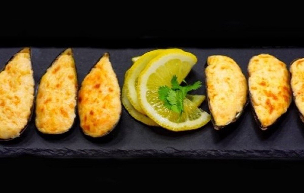 Мидии-гигант в полу створках запечённые со спаси соусом и сыром моцарелла