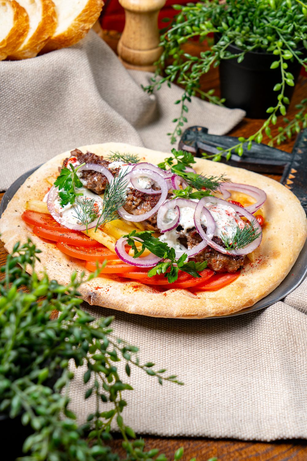 Хрустящая лепёшка, говяжья люля, помидоры ,печеный перец, красный лук, картофель фри, и соус дзадзики
