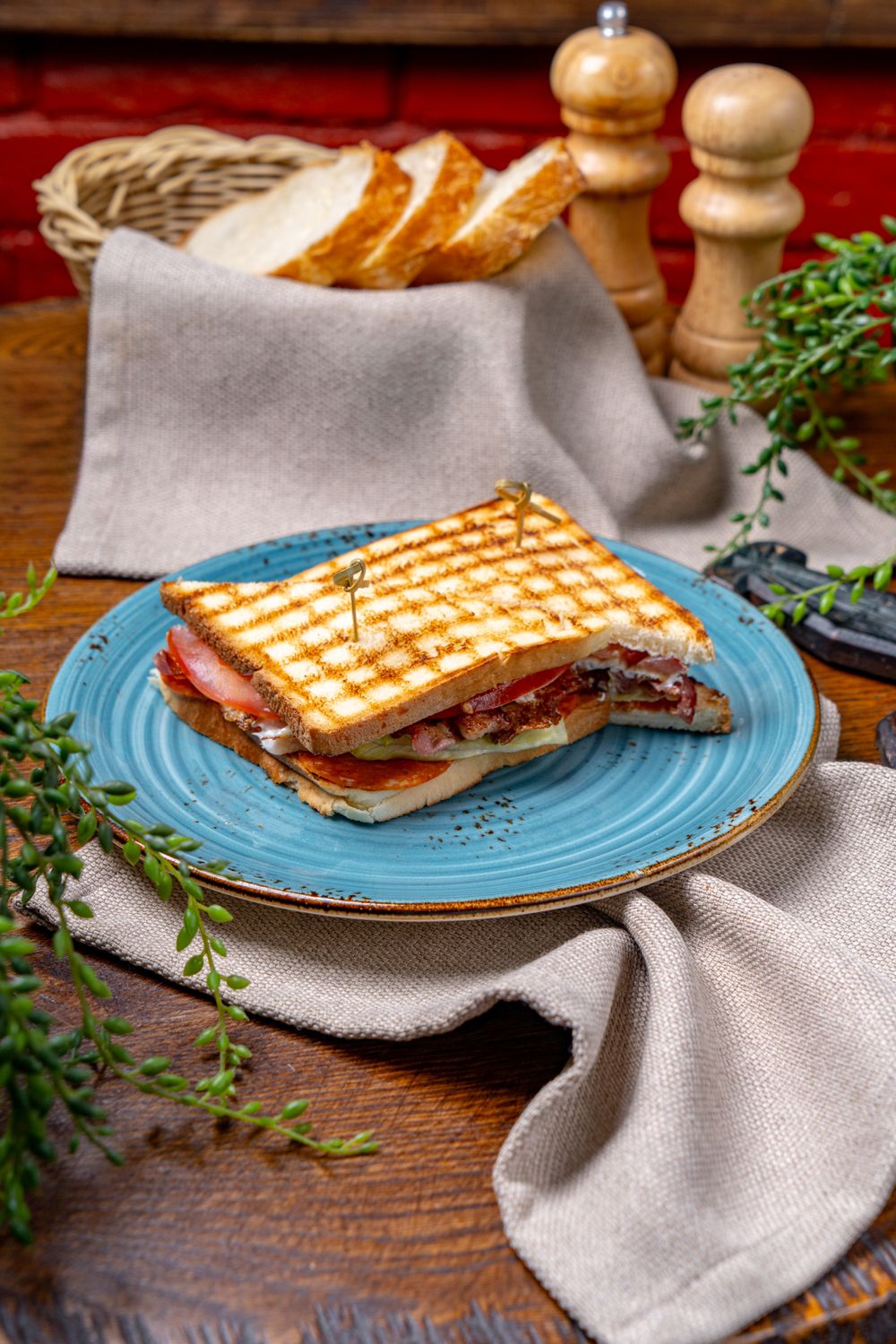 Хлеб харис, бекон, яйцо, пепперони, помидоры, айсберг и творожный сыр
