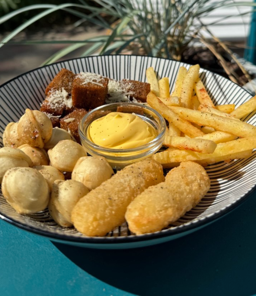 Жаренные пельмешки , сырные палочки, гренки, фри, соус