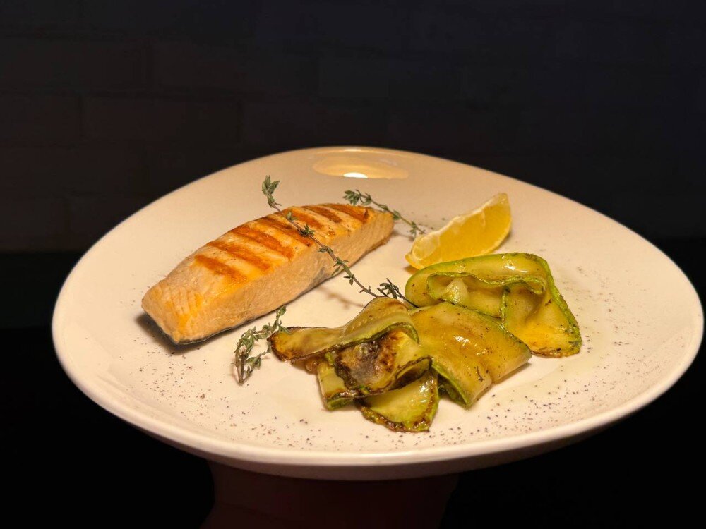 Филе лосося и лимон обжаренные на гриле с тонкими слайсами цукини