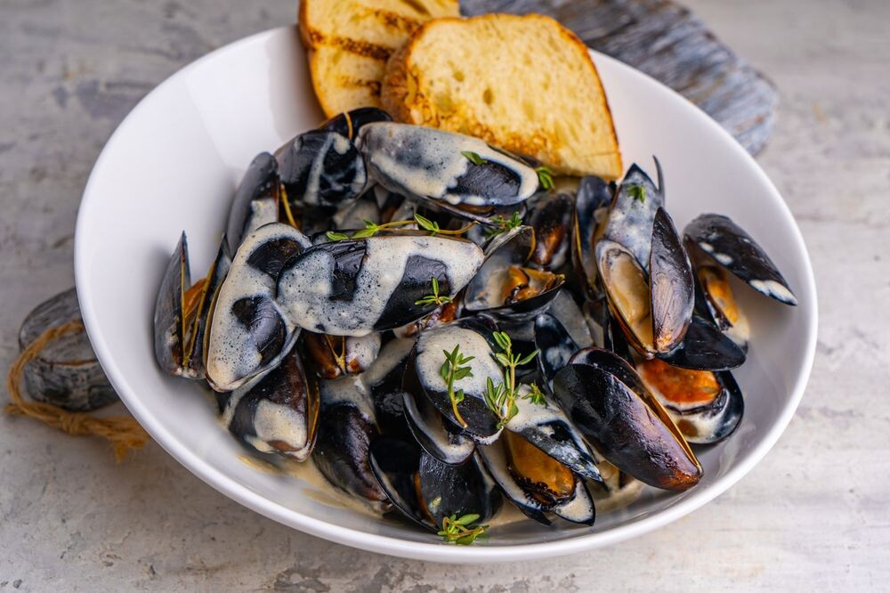 Бесстыже раздвинутые, даже растопыренные раковины этих морских моллюсков поначалу смущают, но уже после первой пробы кулинарный натюрморт становится естественным и аппетитным. Выдержанные в сливочно-чесночном соусе маленькие комочки мидий вроде бы не тянут на полноценное блюдо, но если неспешно осилить всю горку, да с бокалом белого вина, то насыщение приходит, хоть и медленно, но с наслаждением.