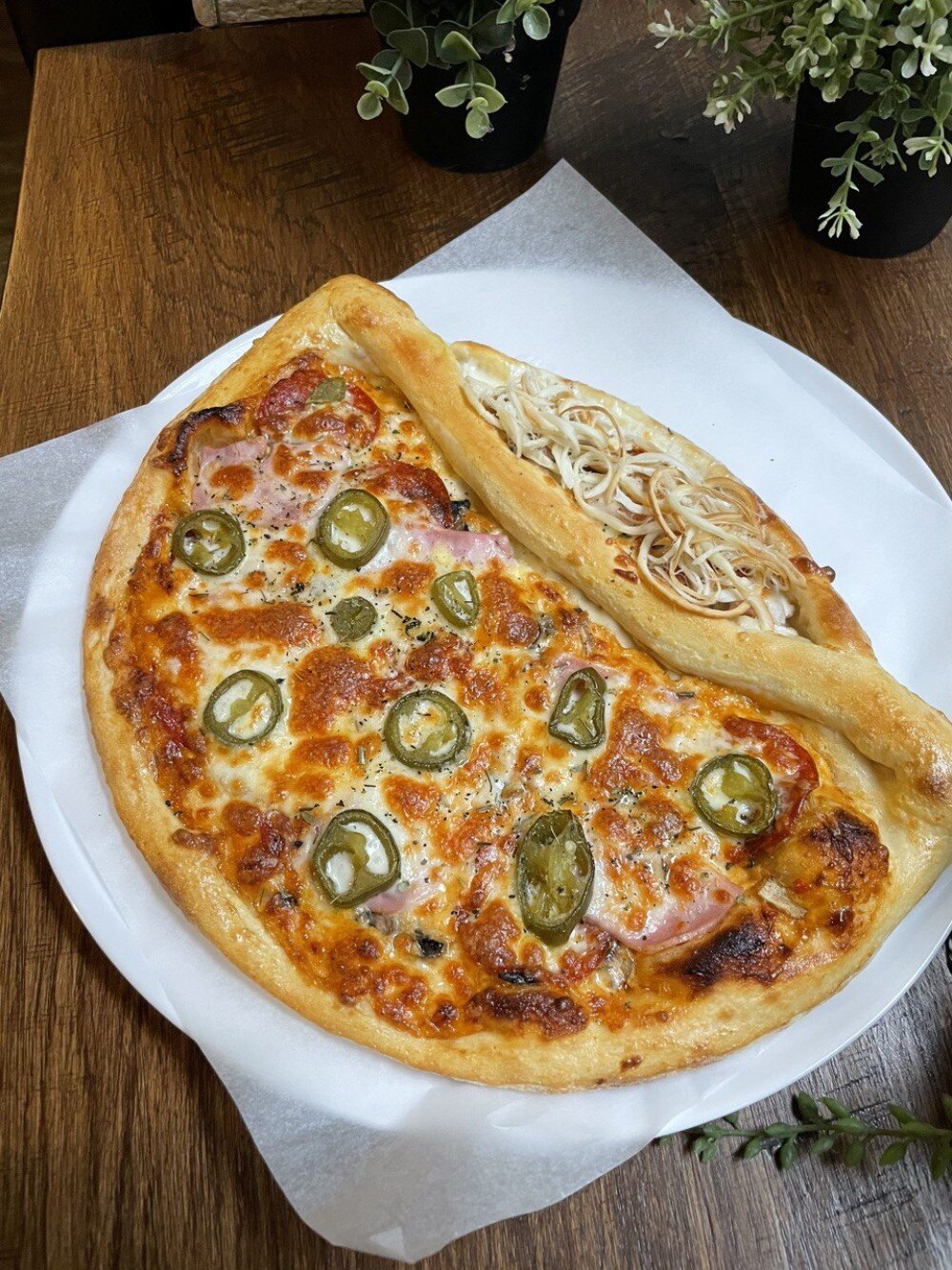 Идеально к пенному: Большая часть: курица, ветчина, колбаска пепперони, шампиньоны, перчик халапеньо Маленькая часть: бекон, сливки, копченый сыр